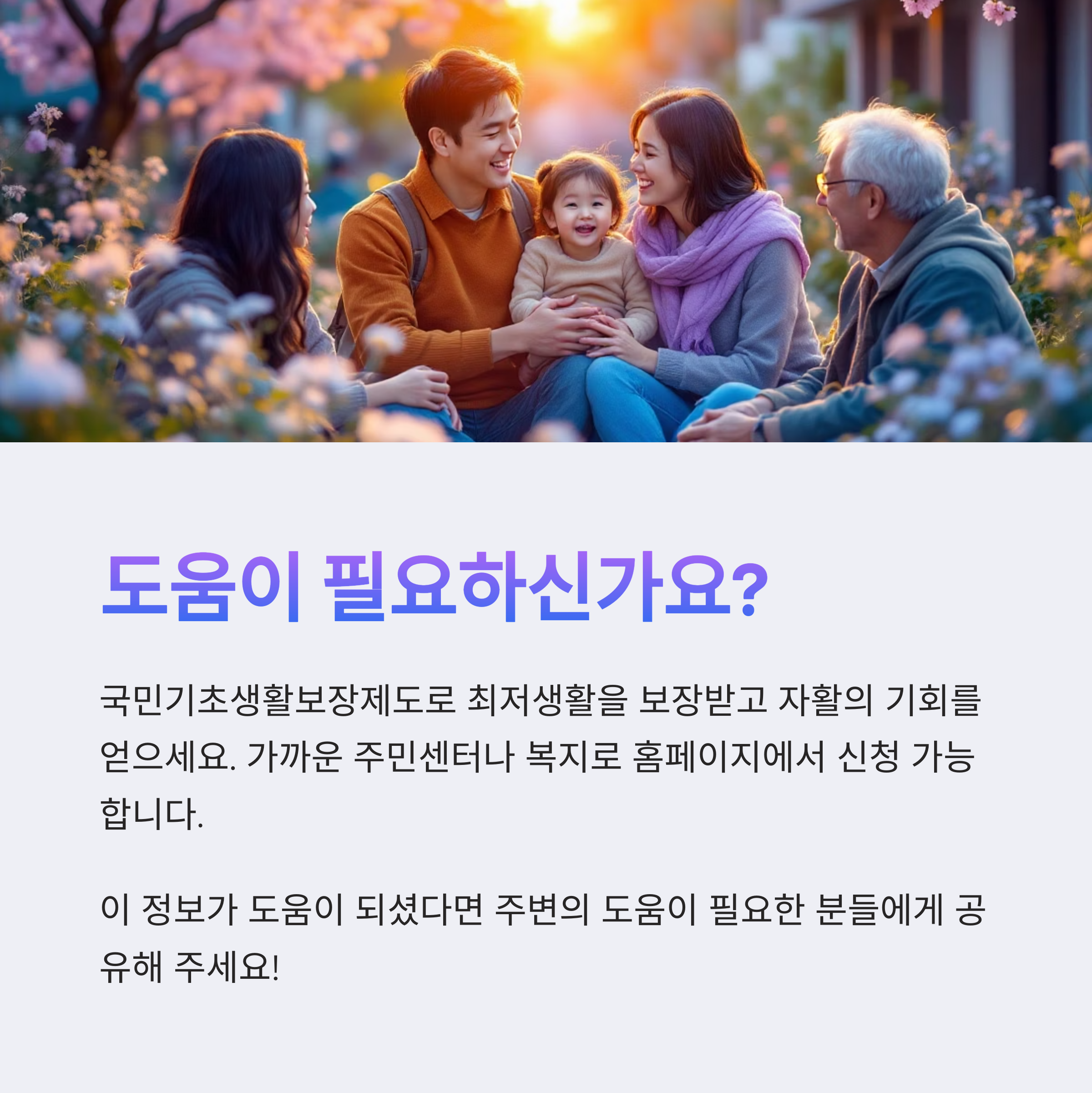 ✔️ 수급자 선정은 가구의 소득인정액과 부양의무자의 소득 및 재산을 기준으로 합니다.