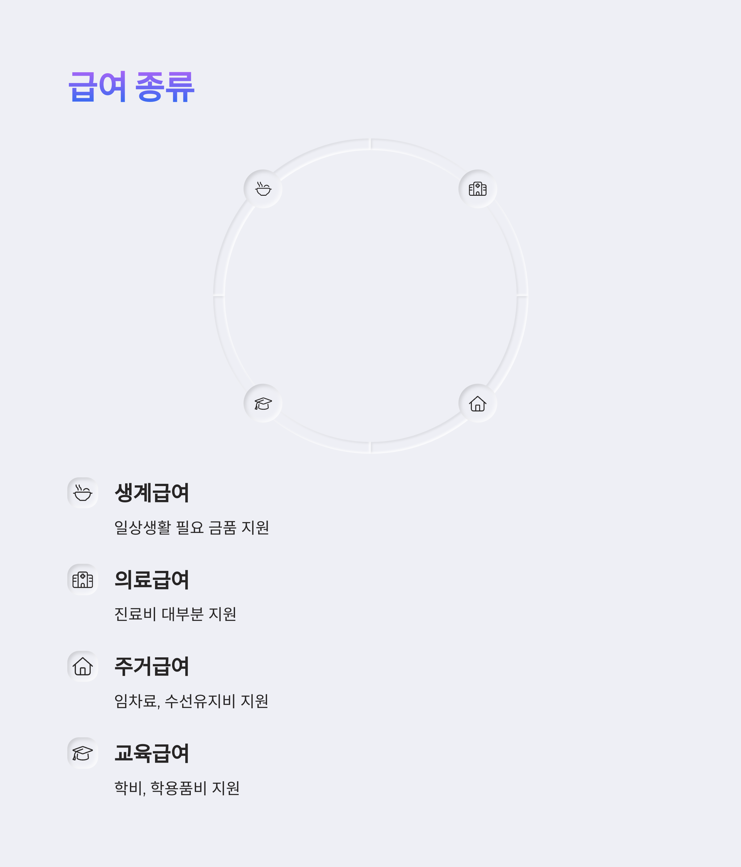 ✔️ 급여 종류에는 생계급여, 의료급여, 주거급여, 교육급여, 해산급여, 장제급여, 자활급여가 있습니다.