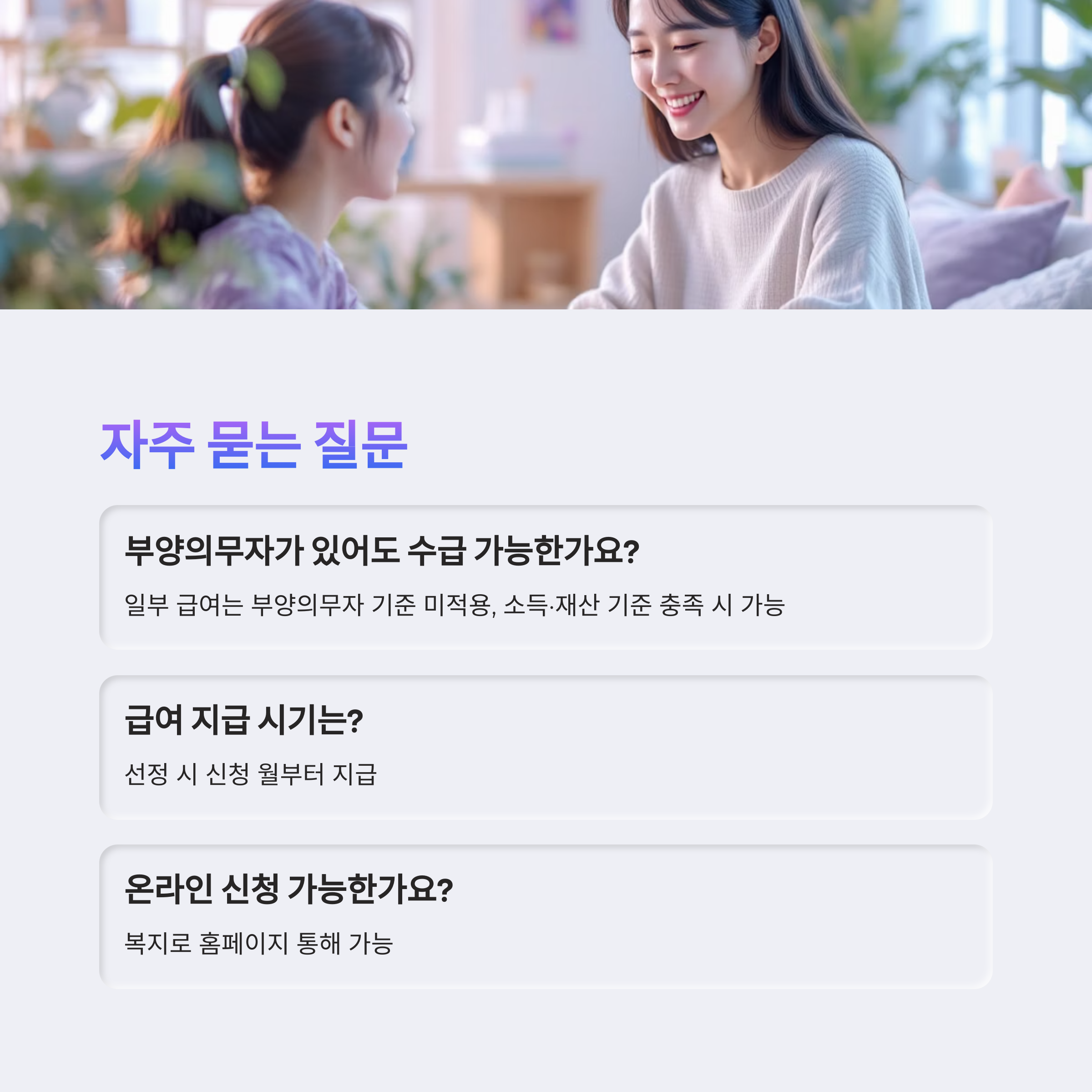 ✔️ 수급자 선정은 가구의 소득인정액과 부양의무자의 소득 및 재산을 기준으로 합니다.