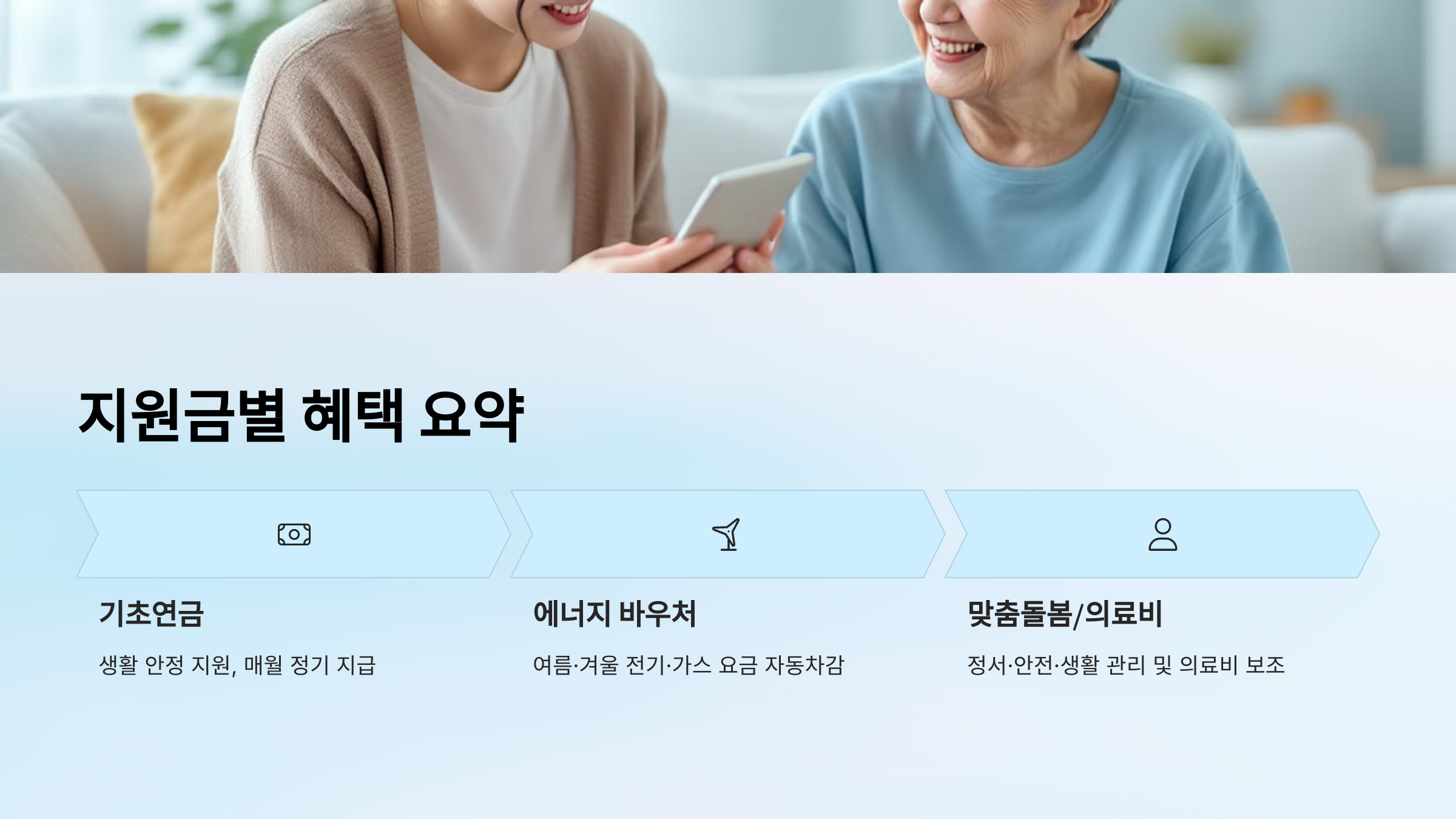 | 에너지 바우처 | 전기·가스·등유 등 겨울·여름 요금 지원 | 세대원 수 따라 연 29만–70만 원 |