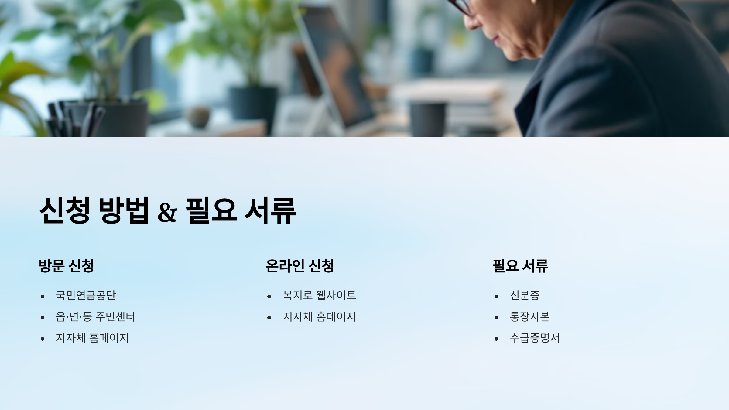 - 기초연금: 국민연금공단 또는 읍·면·동 신청 (신분증, 통장)