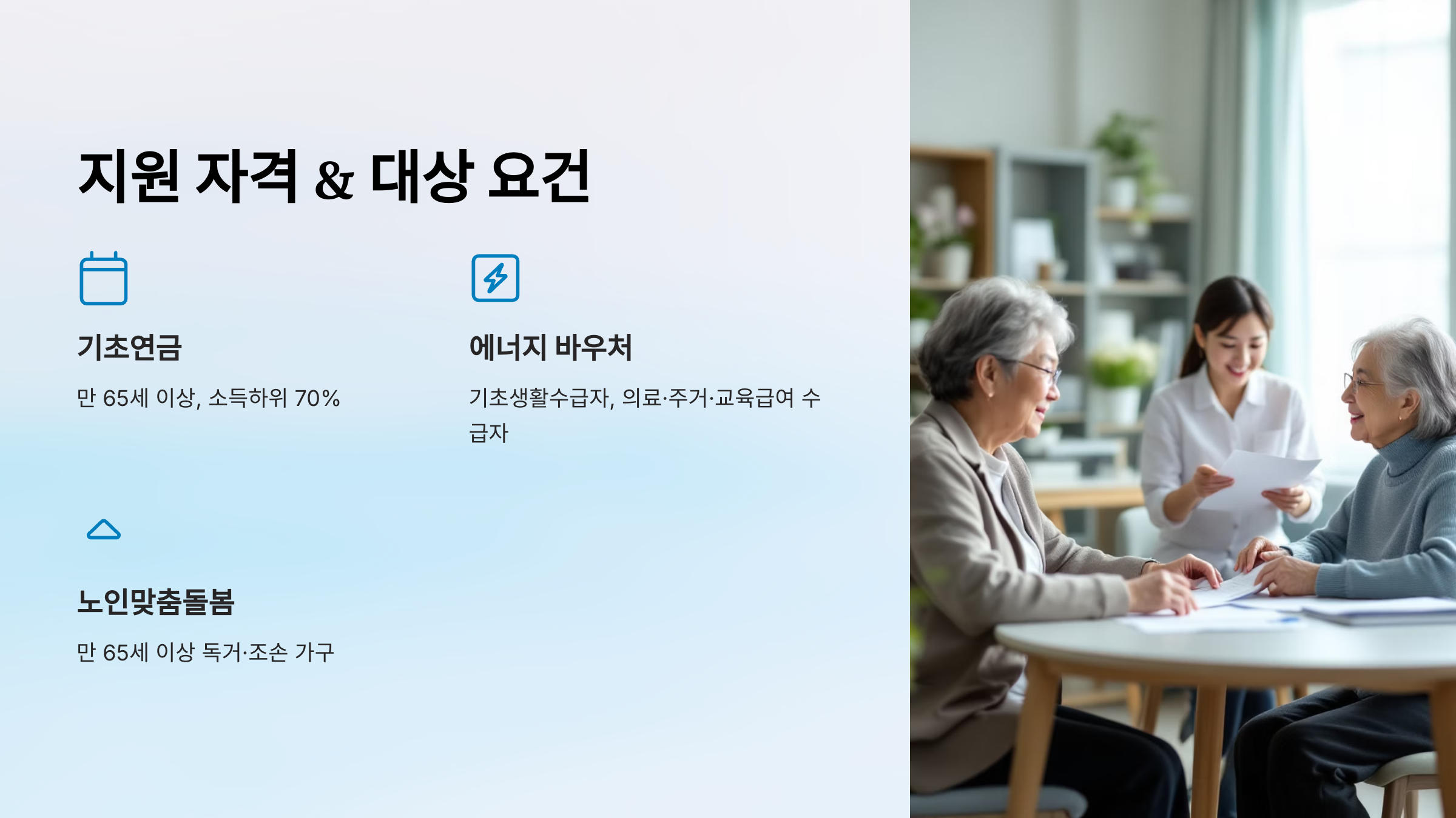 혼자 사는 어르신들을 위한 2025년 최신 지원금 제도를 한눈에 정리했습니다. 기초연금부터 에너지·돌봄 서비스까지, 놓치기 쉬운 주요 5대 지원 항목을 확인하세요.