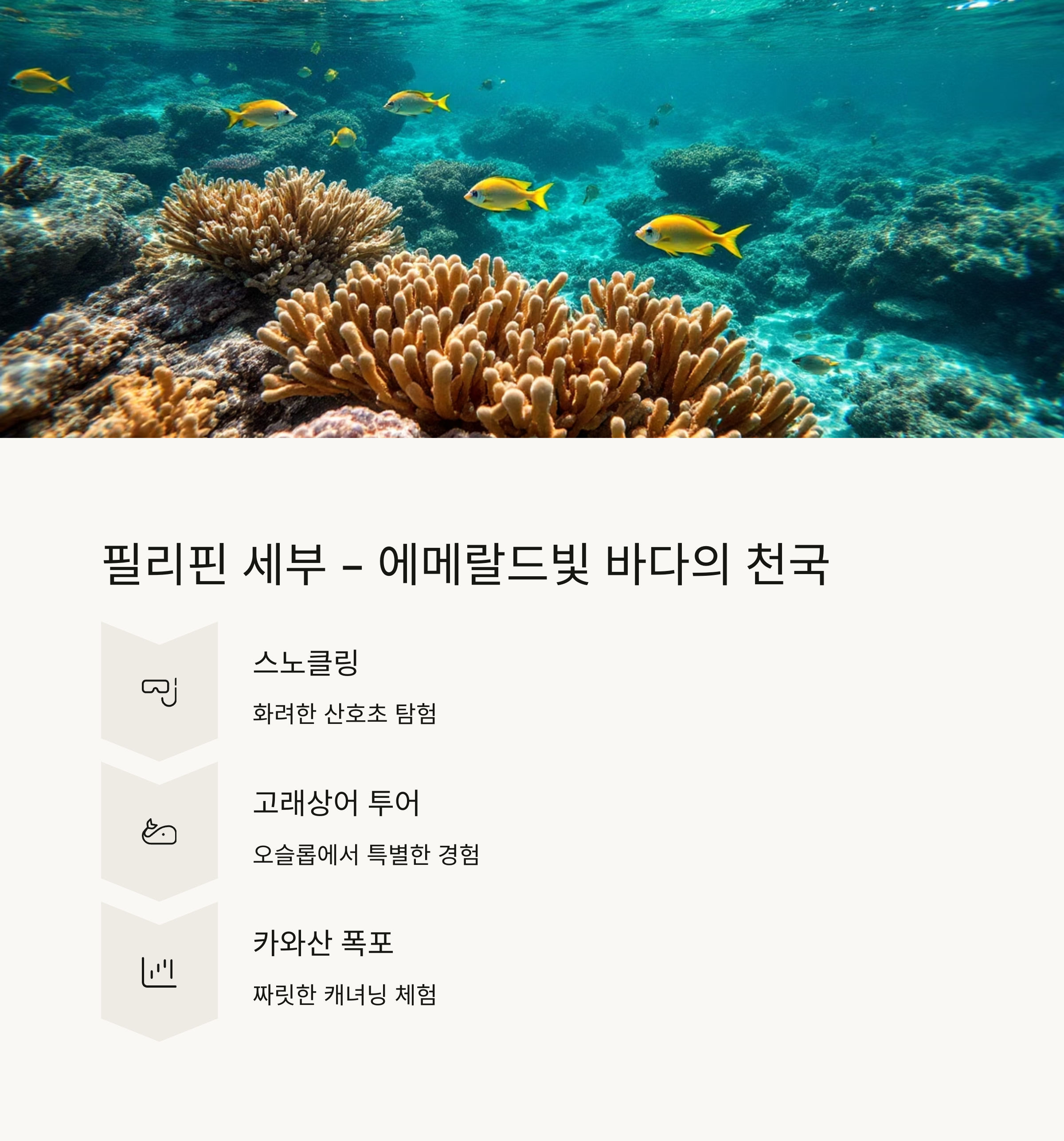 필리핀 세부 | 해양 액티비티 중심 | 스노클링, 캐녀닝, 리조트 |