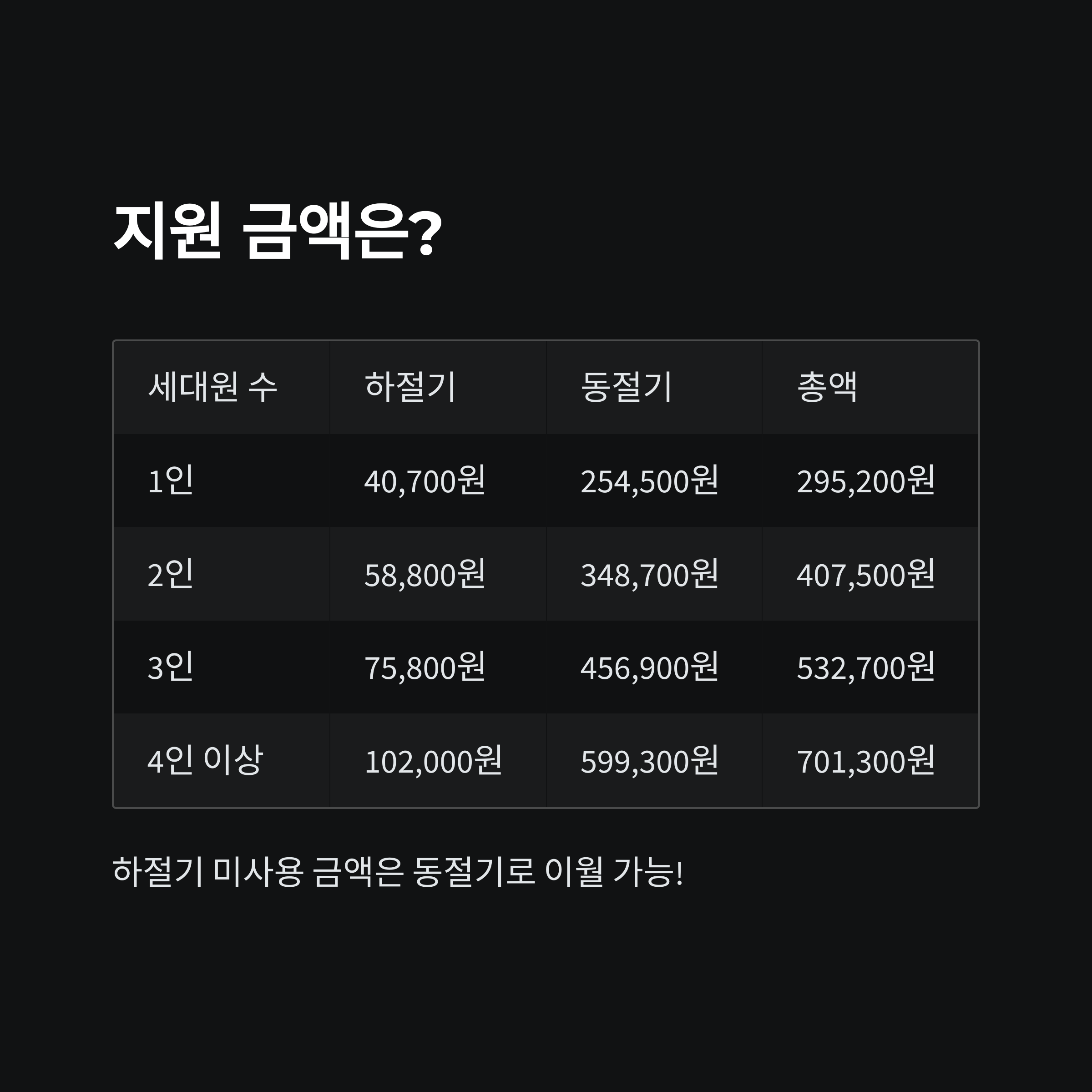 ✔️ 요금 차감 방식: 전기, 도시가스, 지역난방 요금에서 자동 차감됩니다. 하절기에는 이 방식만 가능하며, 별도의 사용 절차 없이 요금 청구 시 차감됩니다.