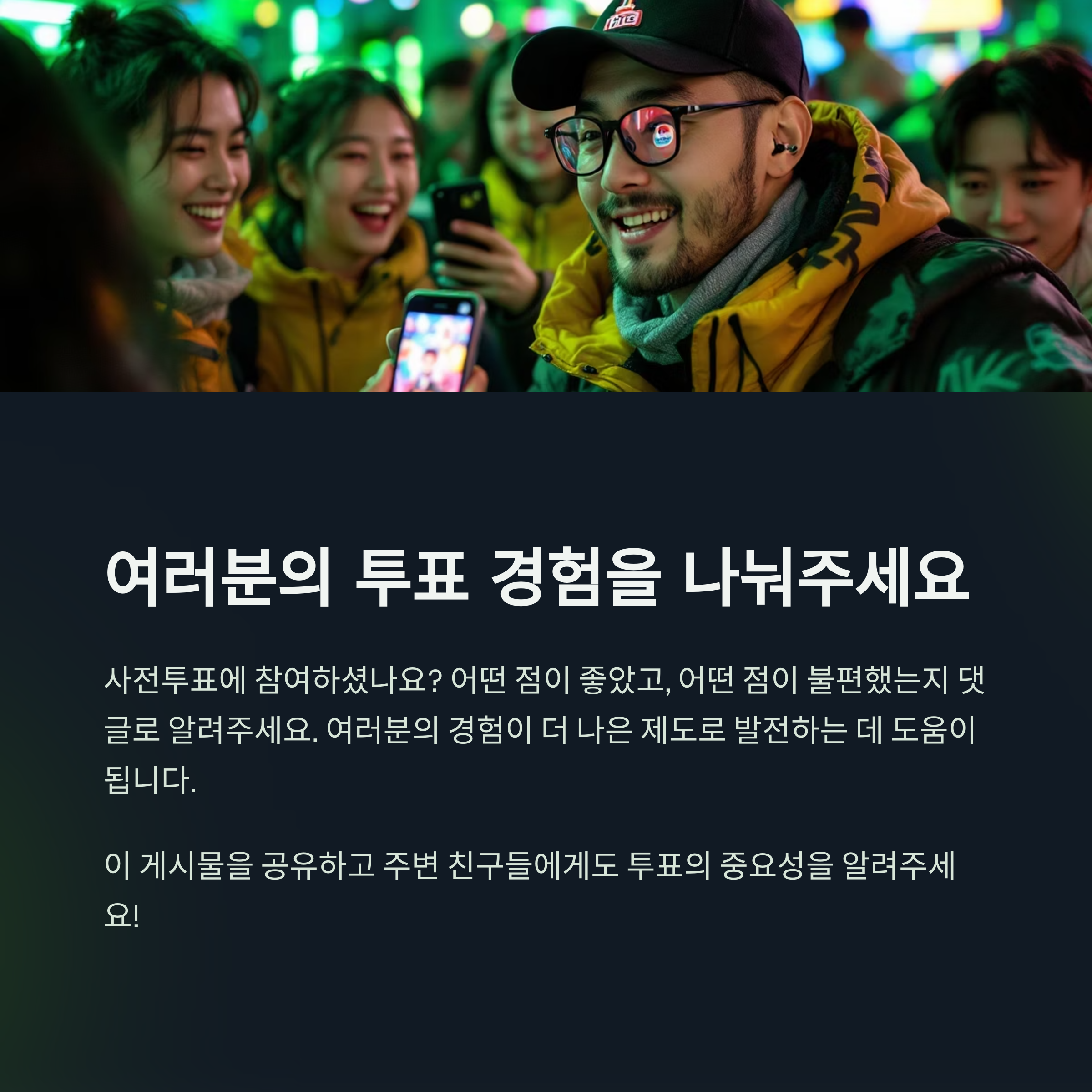 혹시 여러분은 사전투표 자주 하시나요? 이번 대선에서는 어떻게 참여하셨는지, 또는 어떤 점이 불편했는지도 함께 나눠주세요! 다양한 경험이 모이면 더 나은 제도로 발전할 수 있을 거예요 😊