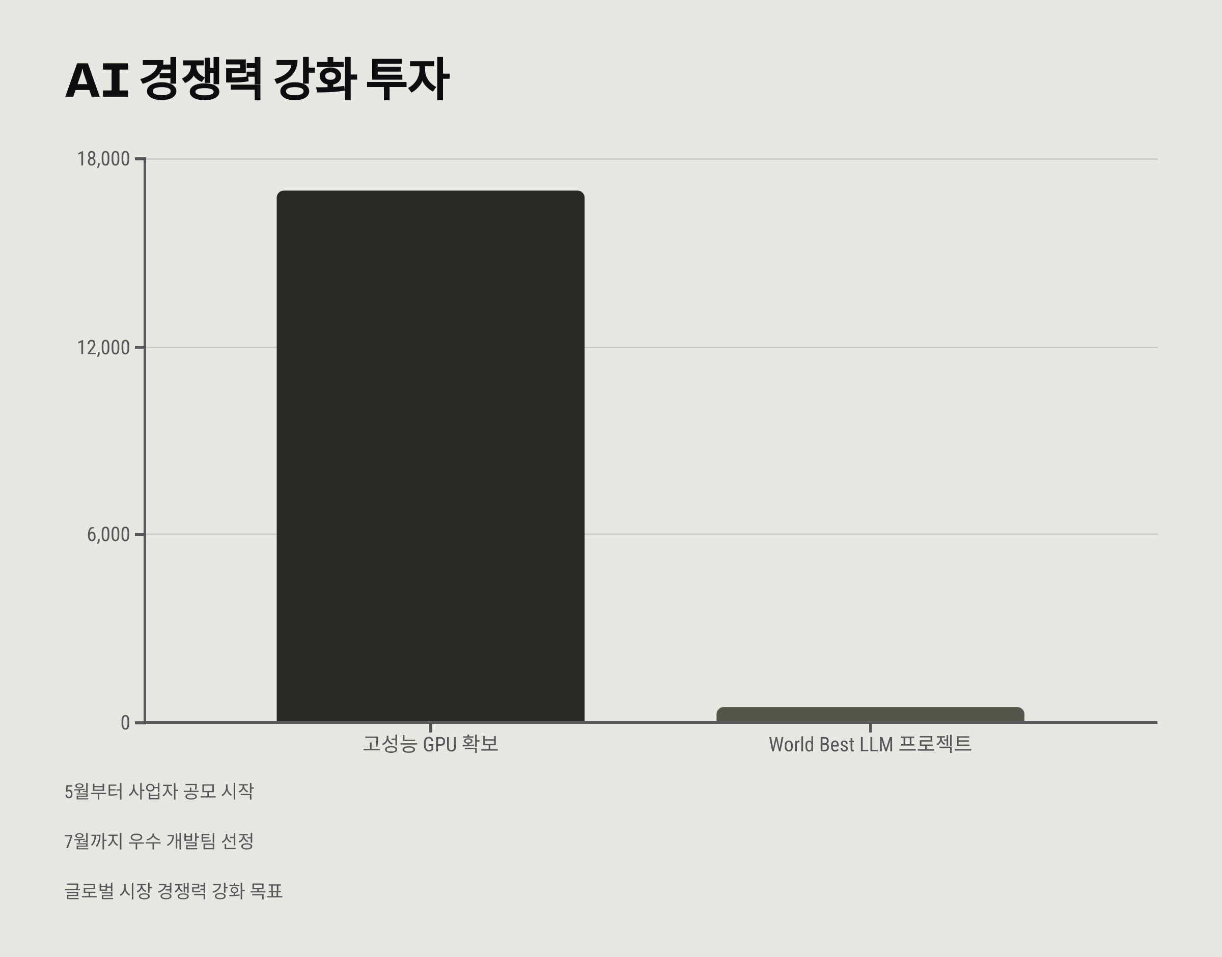 AI 기술의 발전과 글로벌 경쟁력 강화를 위해 정부는 1조 7000억 원의 예산을 투입합니다. 특히 고성능 GPU 확보를 통한 AI 개발 및 'World Best LLM 프로젝트'에 대한 투자도 진행됩니다. 5월부터 사업자 공모를 시작하고, 7월까지 우수한 개발팀을 선정할 계획입니다. 이를 통해 국내 AI 기술의 발전을 가속화하고, 글로벌 시장에서도 경쟁력을 높이는 것이 목표입니다.