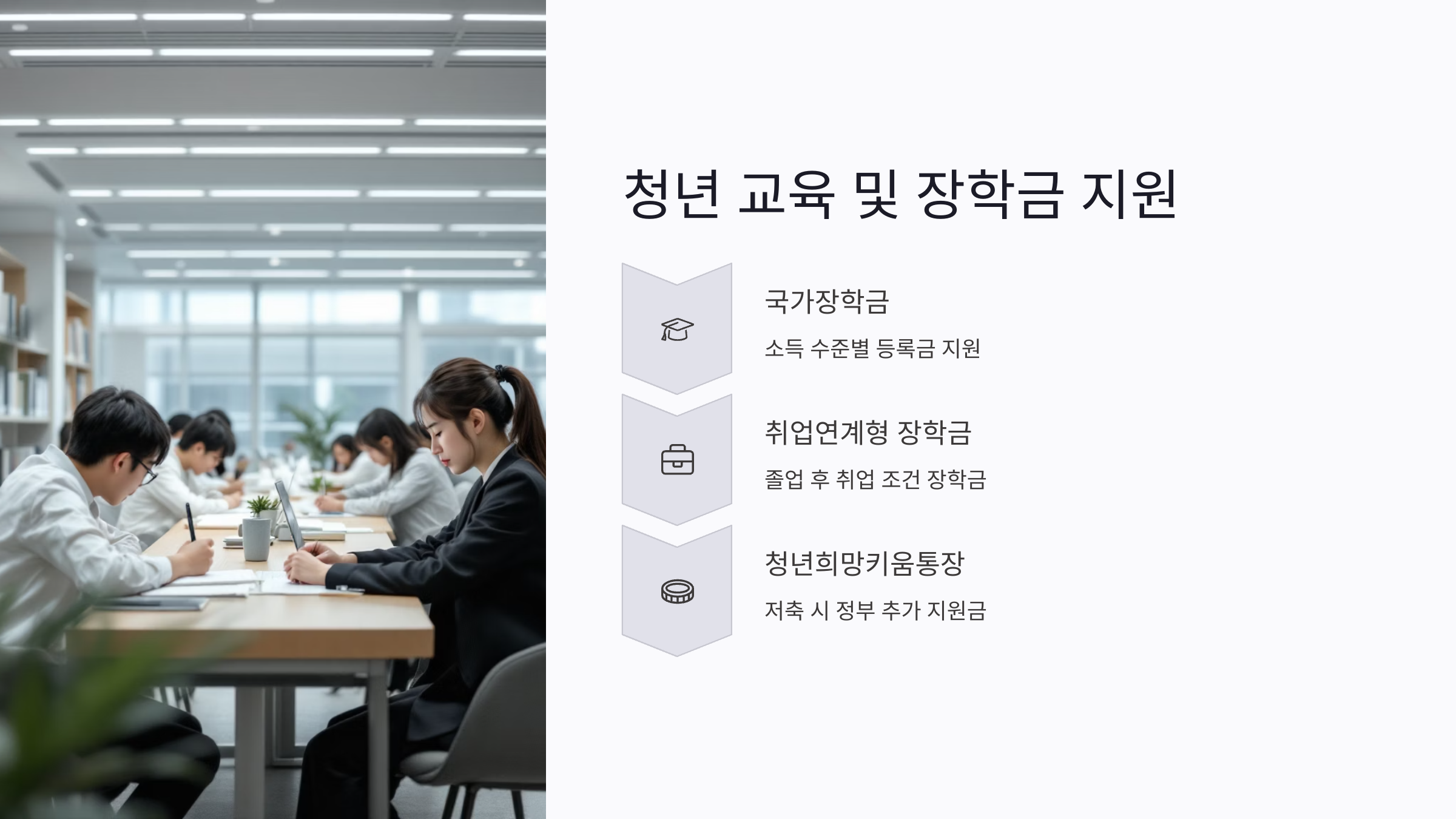 청년들의 교육 기회를 확대하고 경제적 부담을 줄이기 위해 정부는 다양한 교육 및 장학금 지원 프로그램을 운영하고 있습니다. 이를 통해 청년들은 학업에 집중할 수 있으며, 미래를 위한 역량을 강화할 수 있습니다.