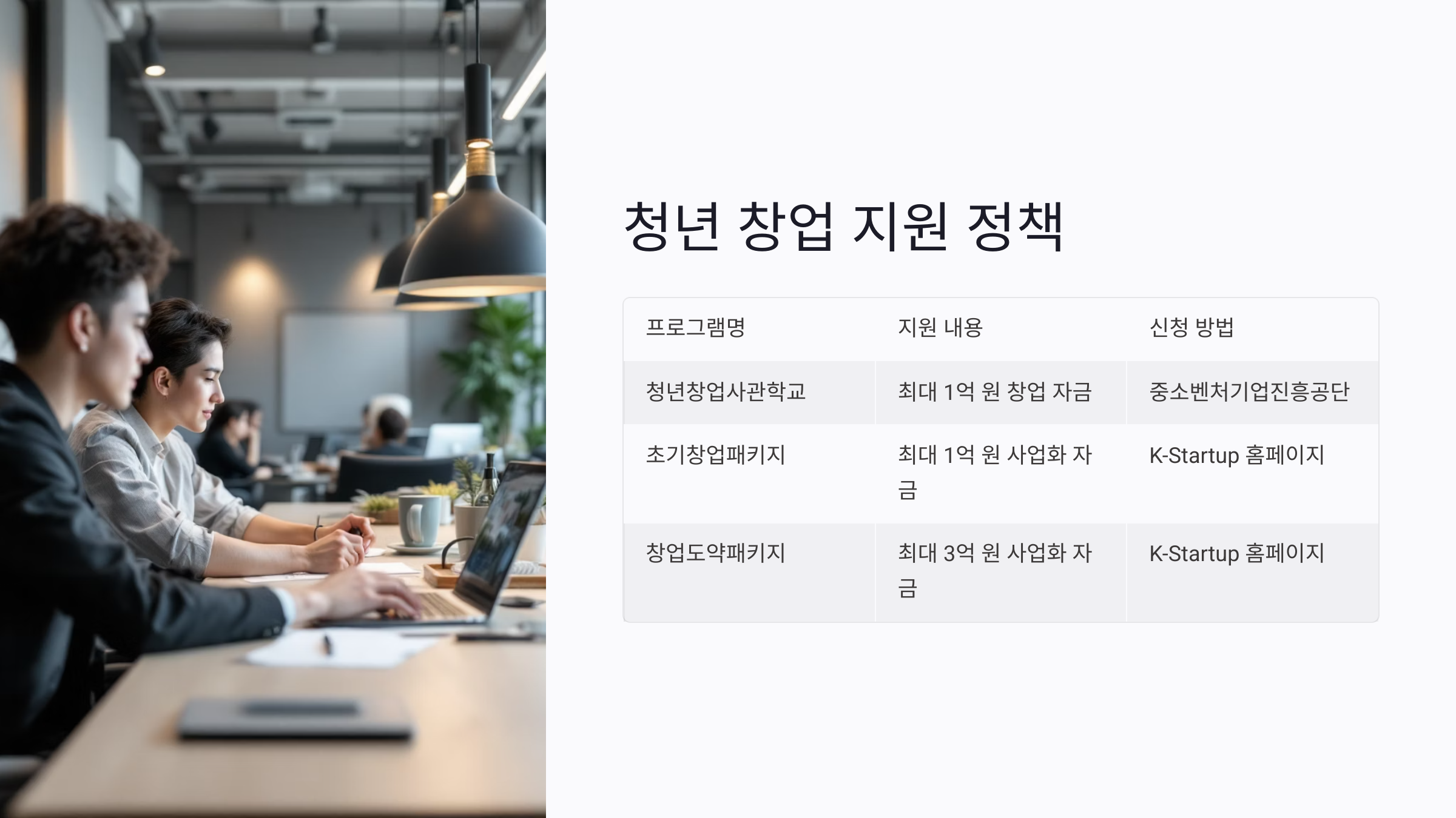 초기창업패키지 | 최대 1억 원의 사업화 자금, 창업 교육 및 네트워킹 지원 | K-Startup 홈페이지를 통해 신청 |