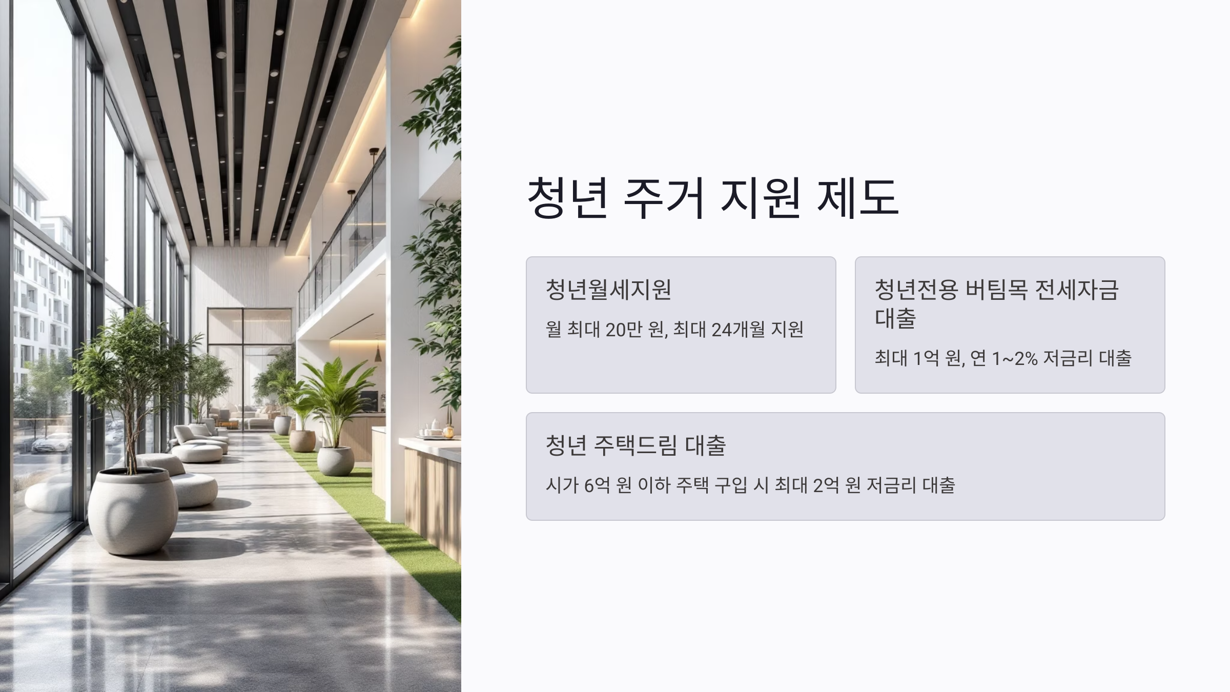 청년들의 주거 안정을 위해 정부는 다양한 지원 제도를 운영하고 있습니다. '청년월세지원', '청년전용 버팀목 전세자금 대출', '청년 주택드림 대출' 등이 있으며, 이를 통해 월세 지원, 전세자금 대출, 주택 구입 자금 등을 지원받을 수 있습니다. 이러한 제도는 청년들의 주거 부담을 줄이고, 안정적인 생활을 돕는 데 큰 역할을 하고 있습니다.