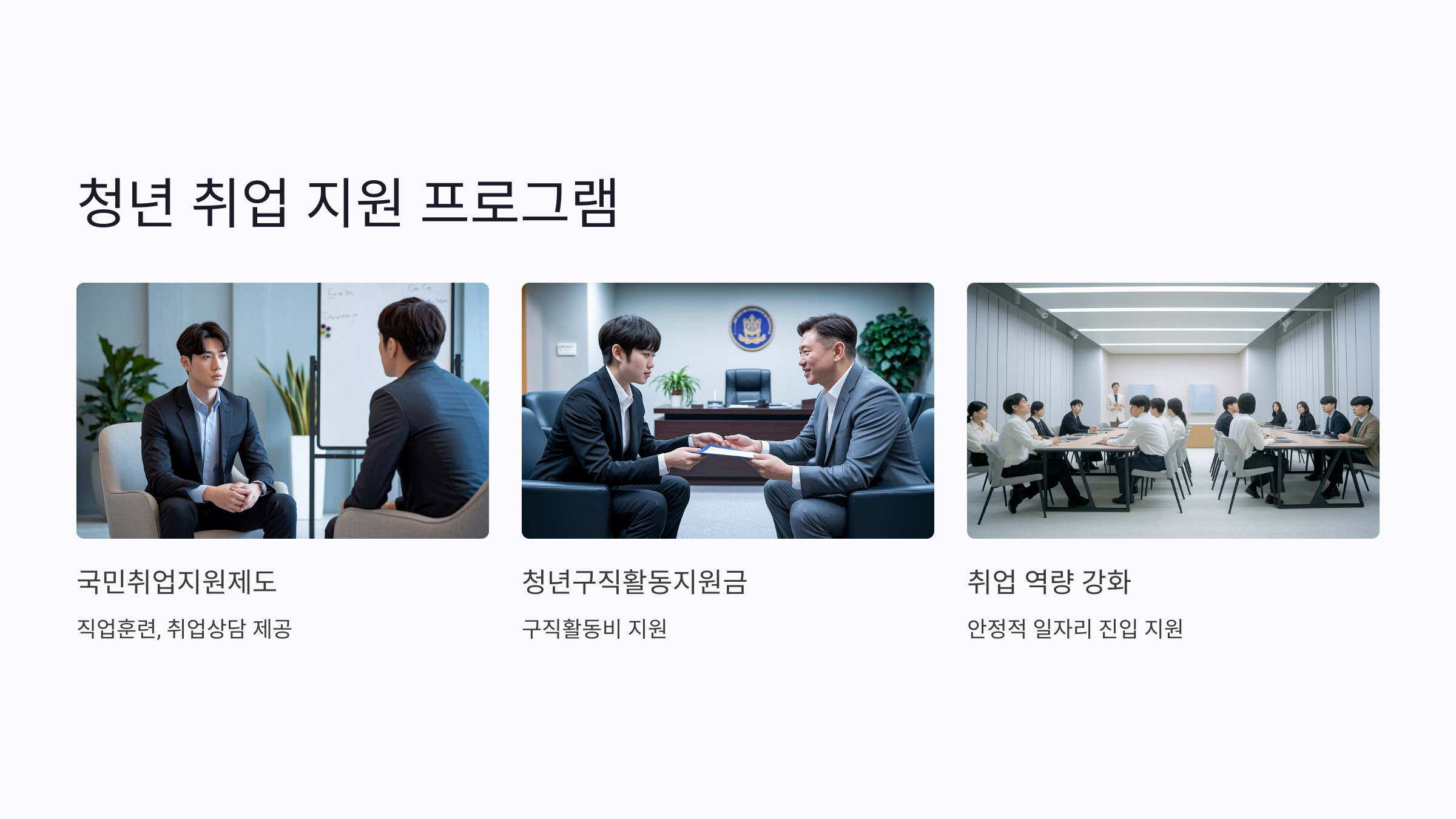 2025년, 정부는 청년들의 취업을 적극적으로 지원하기 위해 다양한 프로그램을 운영하고 있습니다. 대표적으로 '국민취업지원제도'와 '청년구직활동지원금'이 있으며, 이를 통해 청년들은 직업훈련, 취업상담, 구직활동비 등을 지원받을 수 있습니다. 이러한 지원은 청년들의 취업 역량을 강화하고, 안정적인 일자리 진입을 돕는 데 큰 역할을 하고 있습니다.