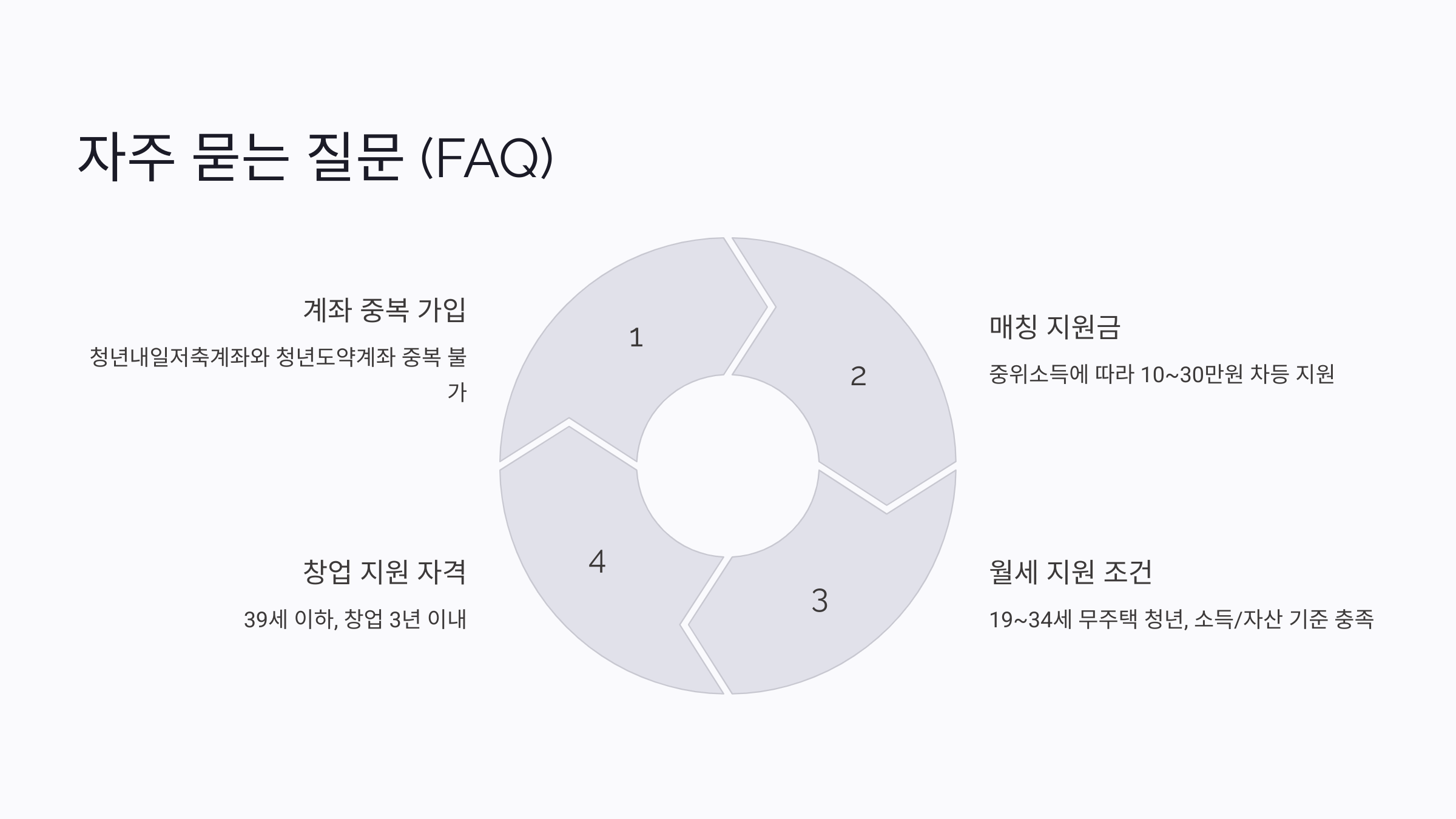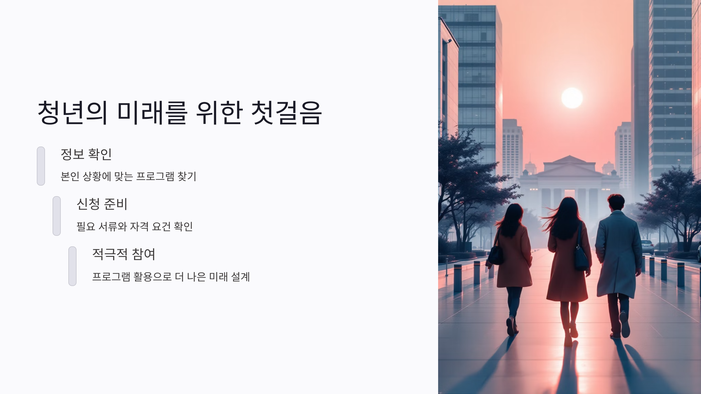 청년 여러분, 위에서 소개한 다양한 지원 프로그램을 통해 여러분의 꿈과 목표에 한 걸음 더 가까워질 수 있습니다. 각 프로그램은 여러분의 상황과 필요에 맞게 설계되어 있으니, 적극적으로 참여하여 더 나은 미래를 설계하시길 바랍니다. 항상 여러분의 도전을 응원합니다!
