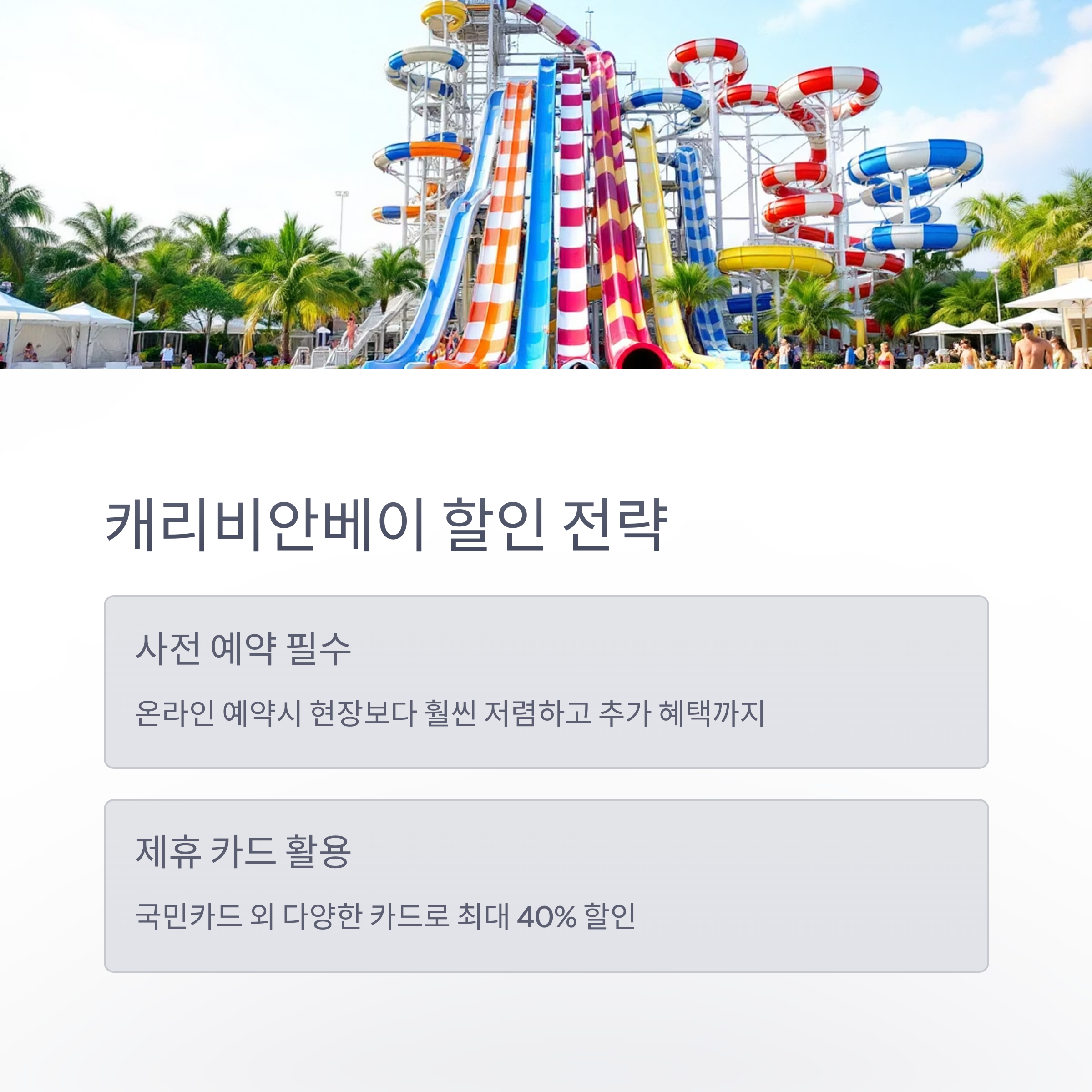 캐리비안베이 | 국민카드 등 제휴카드 최대 40% 할인 | 2025년 여름 시즌 | 온라인 예매 시 추가 할인 가능 |