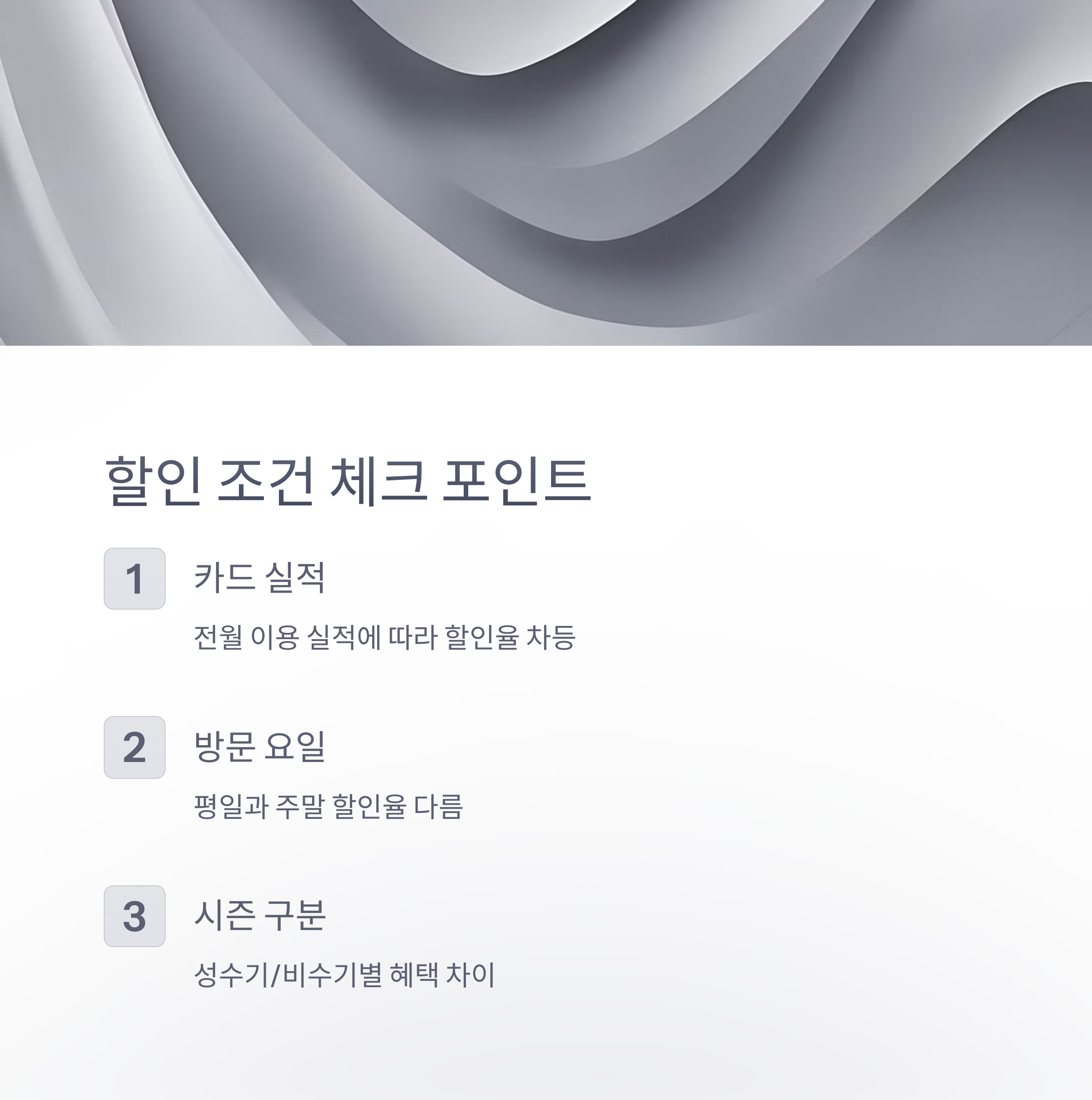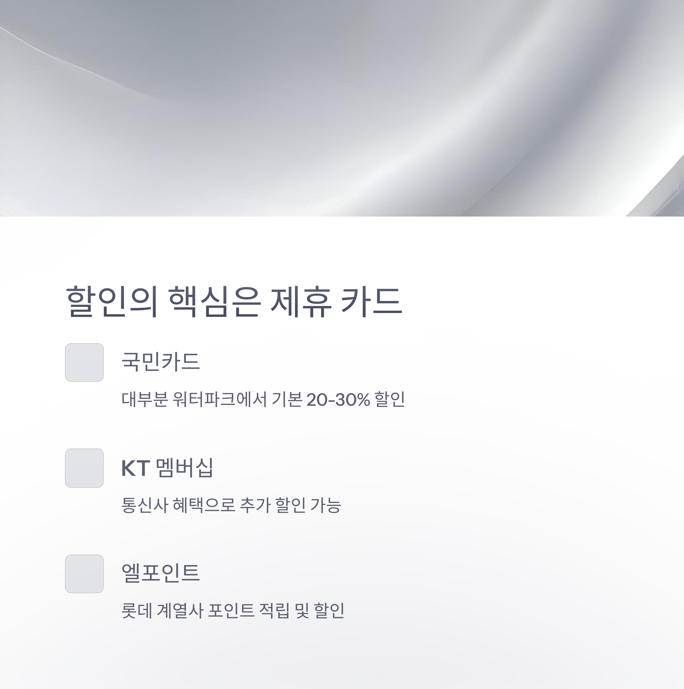KB국민카드 고객이라면 본인은 21,000원, 동반 2인까지는 25,300원으로 이용 가능! 🏖️ 엘포인트 회원이나 KT 멤버십 회원도 혜택이 다양하니 사전 조회는 필수입니다. 단, 입장 전 멤버십 등록 여부와 이벤트 기간 확인 꼭 하세요.