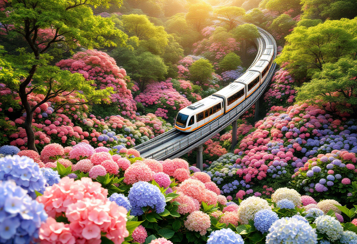 서울 근교 대표 수국정원. 7만 그루 수국 + 모노레일 코스. 예약 필수, 7월 초~중순 절정.