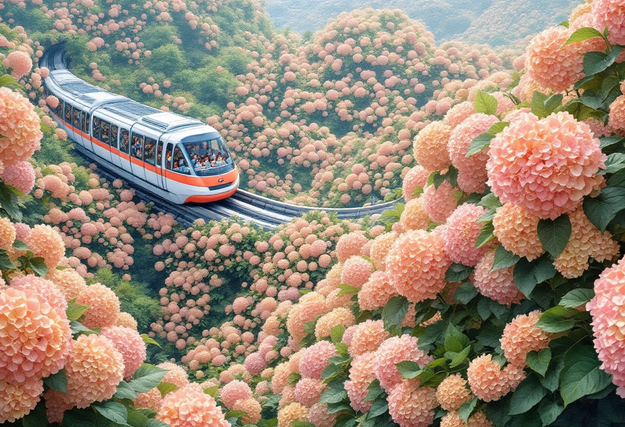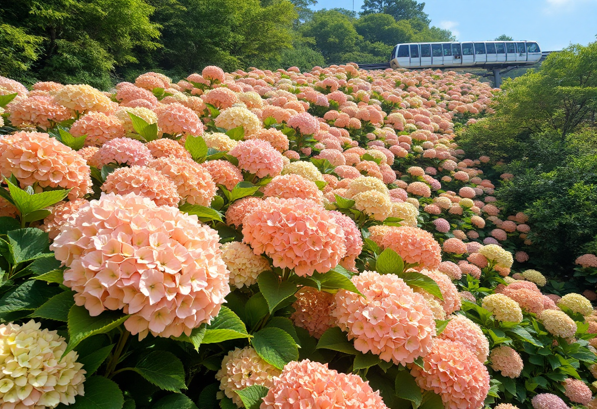 서울 근교 대표 수국정원. 7만 그루 수국 + 모노레일 코스. 예약 필수, 7월 초~중순 절정.